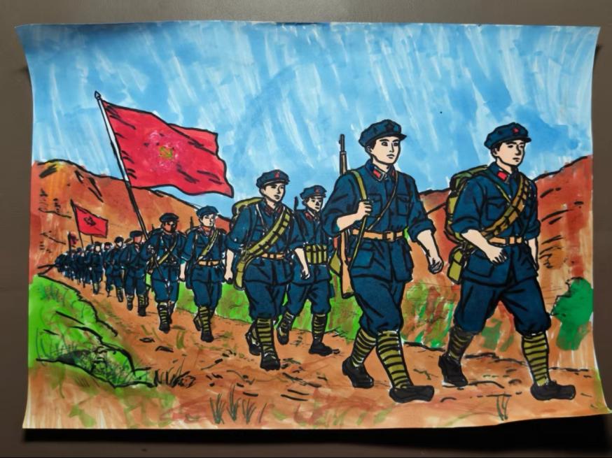 其中,劉桂利同學(xué)緊扣“丹彩繪征途·赤心承長征”的創(chuàng)作核心,完成了一幅長征主題漫畫作品。她以鮮明色彩和細膩筆觸,生動還原紅軍戰(zhàn)士在崎嶇山路上堅毅行軍的場景,展現(xiàn)出革命先輩團結(jié)奮進、不畏艱險的精神風(fēng)貌,用視覺語言傳遞對長征精神的崇高敬意。